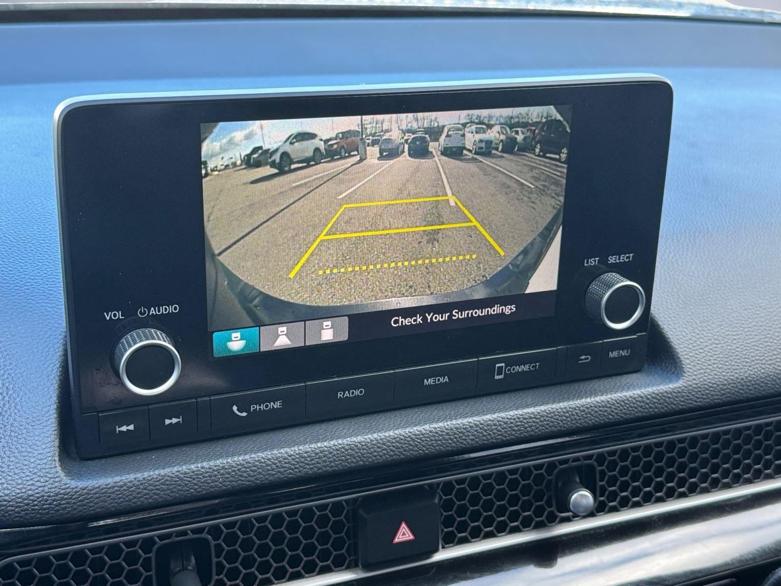 - The vehicle is equipped with a camera that displays an image of the area behind the vehicle on an interior display.